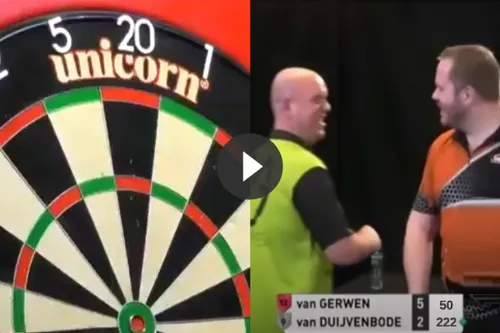 Dirk van Duijvenbode het duo wordt dat Nederland mag vertegenwoordigen op de World Cup of Darts 2021. Dat de heren het wel met elkaar kunnen vinden blijkt uit de volgende beelden die zijn geschoten op één van de PDC-vloertoernooien. Michael van Gerwen legt aan voor bulls-eye om een 10-darter te gooien en met name de reactie van Dirk van Duijvenbode hierop is komisch zoals te zien is op .