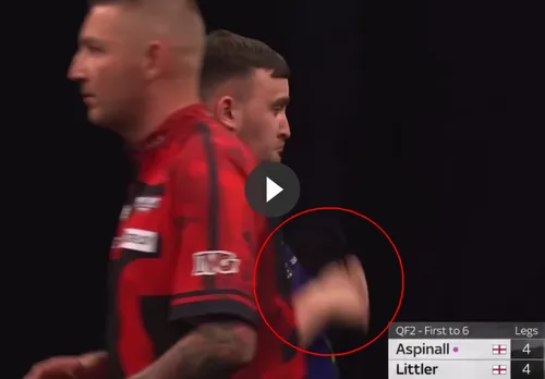 In Leeds kreeg 'The Nuke' opnieuw weinig bijval van het publiek en dat kon hij maar moeilijk verkroppen. Toen Aspinall een 4-3 voorsprong nam, leek de wedstrijd beslist. Hij kreeg zelfs zes kansen om de marge te vergroten, maar liet die onbenut. De wereldkampioen profiteerde echter van de missers en sloeg alsnog toe via zijn geliefde dubbel 10 waarna hij bovenstaande actie uithaalde.
