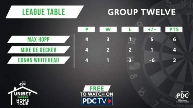 Max Hopp heeft zich dinsdagavond geplaatst voor de tweede ronde van de PDC Home Tour. Met 6 punten eindigde hij boven de Belg Mike de Decker die op 4 punten bleef steken.