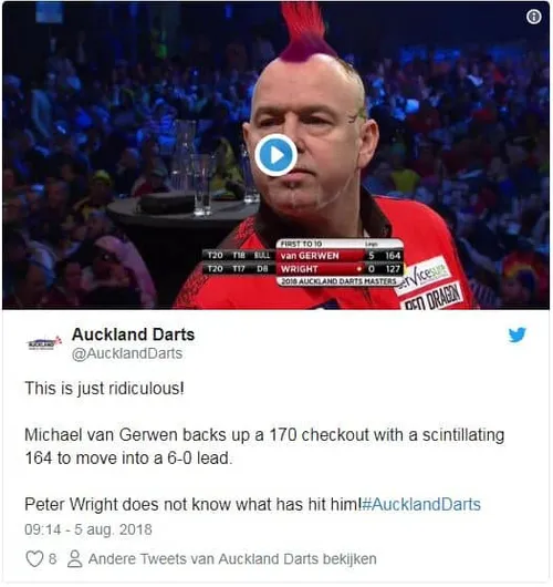 Eerder zagen we Raymond van Barneveld indruk maken door Simon Whitlock te verslaan met aan het eind. Het leek aanleiding voor Michael van Gerwen om dit te overtreffen want een wedstrijd later zorgde de Nederlander ervoor dat Peter Wright werd overklast. Hierbij gooide hij zelfs een 170-finish en een 164-finish op rij waarna hij nogmaals aanlegde voor een 170-finish.
