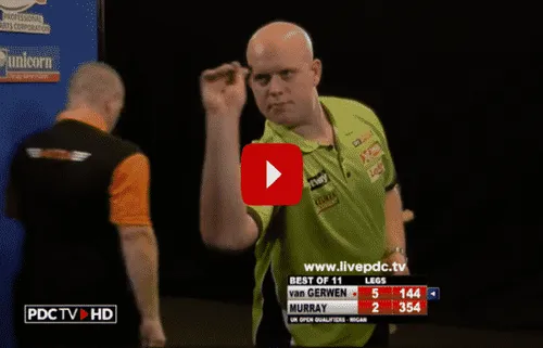 Gisteren was hij er al dichtbij tegen Ricky Evans maar vandaag slaagde hij er dan toch in. Michael van Gerwen heeft een 9-darter gegooid in zijn duel tegen Jermaine Wattimena bij de laatste 16. In tegenstelling tot zijn duel tegen Ricky Evans, waarin de Nederlander de partij , opende hij ditmaal succesvol de openingsleg met 9 perfecte darts. De nummer 1 van de wereld gooide de 9-darter niet op de klassieke wijze maar via 180, 174 en een 147-finish. Spelers die er gisteren ook al in slaagden waren . De wedstrijd is gespeeld op een baan zonder camera's en dus zijn er geen beelden van. Daarom zullen we het moeten doen met beelden van vorig jaar toen Michael van Gerwen voor een nog grotere sensatie te zorgen door twee 9-darters te gooien in één partij op de UK Open. Beelden hiervan zijn wel hieronder te bekijken.