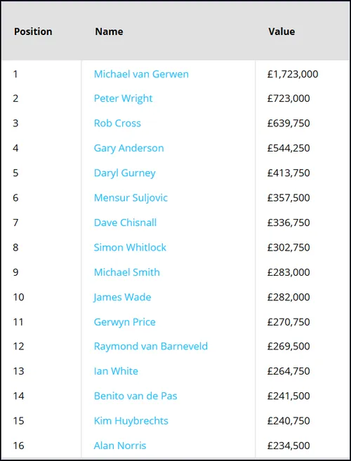 Rob Cross (639.750 pond), Gary Anderson (544.250 pond) en Daryl Gurney (413.750 pond) bezetten achter Peter Wright plek 3 tot en met 5 op de Order of Merit. Wanneer hun waarden worden opgeteld komen ze echter alsnog 125.250 pond tekort op het totaalbedrag van Van Gerwen.