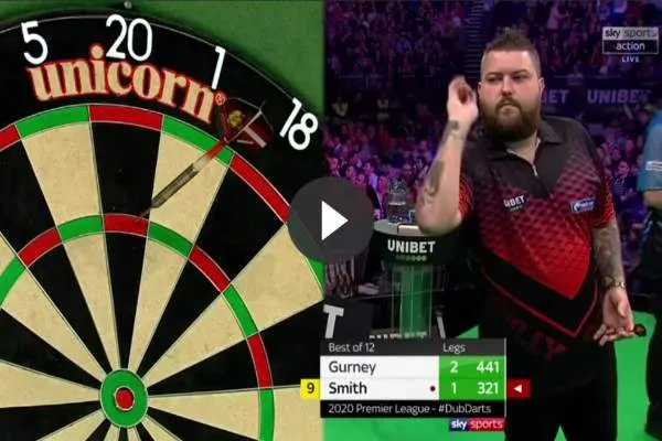 Daryl Gurney. De man uit Saint-Helens gooide in het Ierse Dublin zijn eerste 9-darter op TV. Smith gooide de negende 9-darter in de Premier League en de 55e op TV.