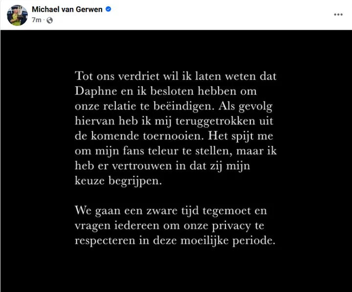 Het volledig bericht: "Tot ons verdriet wil ik laten weten dat Daphne en ik besloten hebben om onze relatie te beëindigen. Als gevolg hiervan heb ik mij teruggetrokken uit de komende toernooien. Het spijt me om mijn fans teleur te stellen, maar ik heb er vertrouwen in dat zij mijn keuze begrijpen. We gaan een zware tijd tegemoet en vragen iedereen om onze privacy te respecteren in deze moeilijke periode."