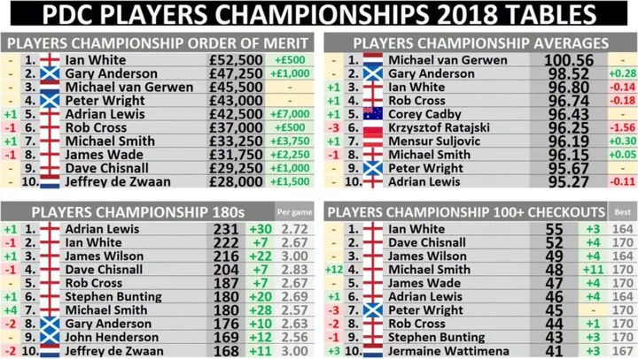 Michael van Gerwen de enige speler die erin slaagde om over het hele jaar een gemiddelde te gooien van boven de 100,00. Zijn jaargemiddelde op de Players Championship 2018 kwam uit op 100,56.