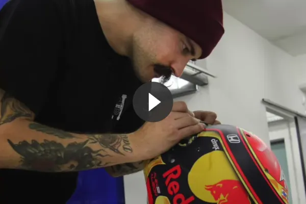 Maar er is meer opmerkelijks aan de Italiaan want hij werkt namelijk voor grote namen in de Formule 1. Hij ontwerpt en spuit de helmen voor enkele rijders namens Red Bull, Ferrari en Williams. Voor welke coureurs hij welk ontwerp heeft gemaakt laat hij zien in