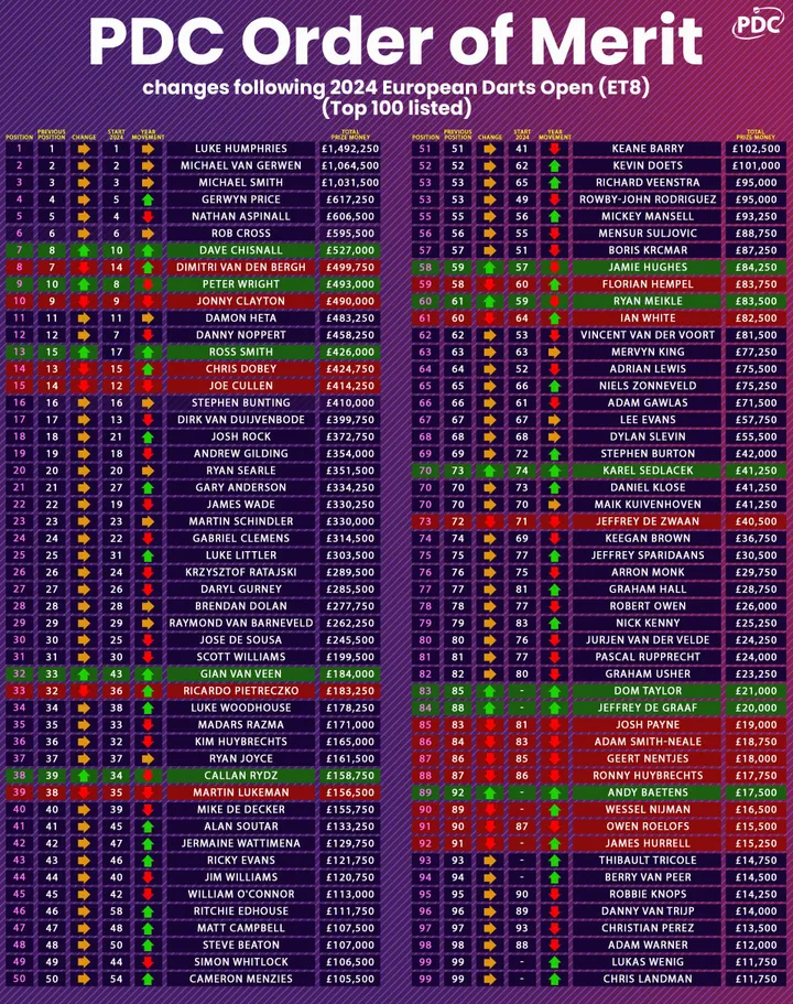 De PDC Order of Merit is gebaseerd op het prijzengeld dat over een periode van twee jaar door spelers in PDC-rankingevenementen is gewonnen. Deze ranglijst weerspiegelt de consistentie en prestaties van de spelers in de grootste toernooien van de sport.