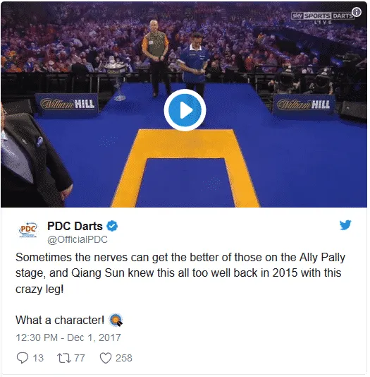 video plaatsen om alvast warm te lopen voor het aanstaande wereldkampioenschap. We starten met een video van de Chinees Qiang Sun die de aanstaande editie helaas zal ontbreken. Iedereen zal zich herinneren dat hij vorig jaar over de oche viel bij zijn opkomst (), maar een jaar eerder kende hij een zeer opmerkelijke openingsleg. Zijn eerste pijl belande bijna in de bulls-eye, waarna hij zelf het publiek begon op te zwepen. In dezelfde leg gooit hij 137 punten terwijl hij op een finish stond van 133 om vervolgens in de herkansing vanaf 133 een pijl volledig buiten het bord te gooien.