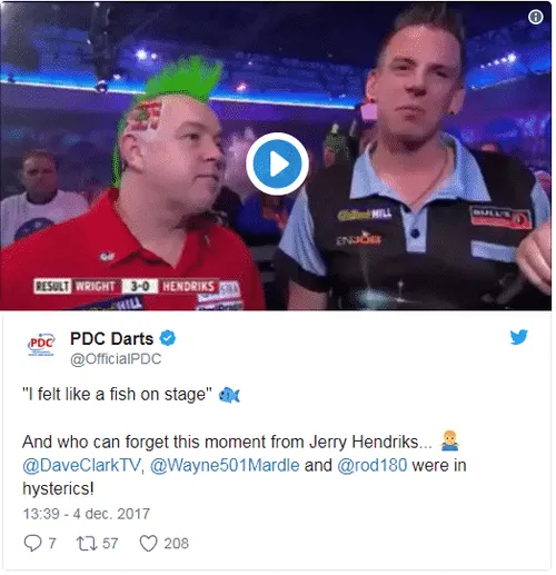 Jerry Hendriks had het vorig jaar duidelijk naar zijn zin bij zijn opkomst op het PDC WK maar ook na zijn duel met Peter Wright zat de Nederlander nog vol adrenaline. Hij voelde zich als een vis in het water op het podium van Ally Pally, of zoals Jerry Hendriks verwoorde: "I feel like a fish on the stage". Zijn reactie zorgde voor een slappe lach in het commentaar hok bij Sky Sports waar Wayne Mardle en Dave Clark dubbel lagen van het lachen. Hij heeft zich hiermee voor eeuwig op de kaart gezet en om nogmaals te genieten van dit hilarisch moment blikken we met onderstaande video terug op zijn schitterende walk on gevolgd door de komische uitspraak.