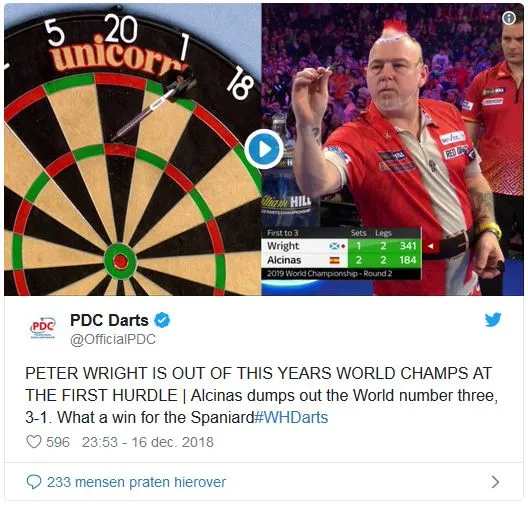 Raymond van Barneveld. Ross Smith (91,89) 3-1 Paul Lim (91,28) (3-2, 3-0, 0-3, 3-0)Met 3-2 ging de eerste set naar Ross Smith die daarmee de legende in de problemen wist te brengen. Een set later werden de problemen nog groter toen met 3-0 ook de tweede set werd opgeëist door Smith met onder andere een 138-finish. The Singapore Slinger leek zich te herpakken en pakte set 3 zonder een leg af te staan maar een set later waren de rollen omgedraaid en daarmee was het doek gevallen voor Paul Lim. Peter Wright (94,70) 1-3 in sets Toni Alcinas (93,12) (2-3, 1-3, 3-0, 1-3) De Spanjaard nam een 2-0 voorsprong waarna Peter Wright met een 167-finish terug kwam tot 2-2. Maar met een 109-finish ging set 1 alsnog naar Alcinas. In de tweede set was het met 3-1 weer Toni die hem naar zich toe haalde. Uit het niets kwam Santa vervolgens de derde set naar zich toe halen met onder andere een 10-darter. Maar in de vierde set viel het doek want met 3-1 was het Toni Alcinas die de sensatie compleet maakte.