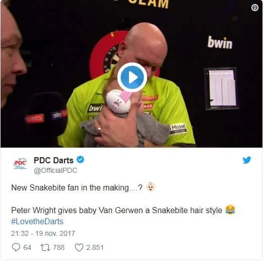 Peter Wright lijkt een poging te doen om de dochter van Michael van Gerwen op zijn beurt weer tot zijn fans te mogen toerekenen. Zoals op onderstaande beelden is te zien maakte Wright namelijk een Snaktebite-kapsel bij Zoë van Gerwen tijdens de prijsuitreiking.