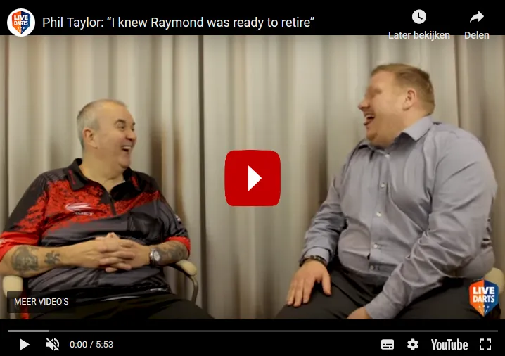 Raymond van Barneveld het einde van zijn carrière aangekondigd. sprak met de 16-voudig wereldkampioen en daarbij kwam ook het aangekondigde pensioen van zijn voormalige rivaal ter sprake. Phil Taylor grapt dat Raymond alles nadoet wat hij zelf ook heeft gedaan alvorens hij er serieus op inging. "Raymond is er aan toe om met pensioen te gaan, maar als ik hem was had ik nog even gewacht. Hij is op dit moment mentaal niet in staat om het PDC WK 2019 te winnen, maar als hij een hele goede pot speelt in de eerste ronde kan dit zomaar veranderen," aldus The Power Taylor oppert dan ook dat wanneer de Nederlander het ver schopt op het aanstaande wereldkampioenschap, dat hij zijn besluit dan wellicht te vroeg heeft genomen. Het volledig interview is hieronder te bekijken.