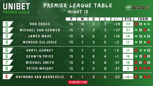 Winst of gelijkspel is voldoende om zich te verzekeren van de play offs. Als Daryl Gurney of Mensur Suljovic niet wint is hij al gekwalificeerd voor hij zijn partij zal spelen.