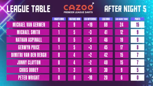 Deze donderdag staat de zesde speelweek van de Premier League of Darts op het programma. Michael van Gerwen staat aan kop. In theorie kan de top 4 afstand nemen van de concurrentie in de strijd om de play-offs. Immers staan naast Van Gerwen ook Michael Smith, Nathan Aspinall en Gerwyn Price in de top 4 en ontlopen zij elkaar in de kwartfinales.