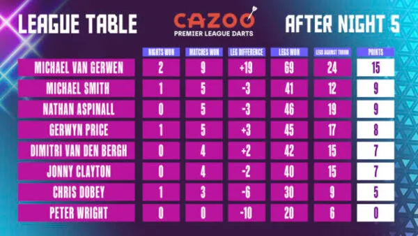 Deze donderdag staat de zesde speelweek van de Premier League of Darts op het programma.