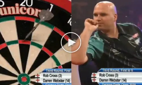Darren Webster op de German Darts Masters bijna met een 9-darter afgesloten. Voltage wist de 10e leg van de partij met tweemaal 180 te openen en zag na twee beurten 141 op het scorebord staan. Met een voorsprong van 5-4 zou het de ultieme afsluiter van de partij zijn. De regerend wereldkampioen wist het publiek in Duitsland op de banken te krijgen met zijn poging voor perfectie. De beelden zijn hieronder te bekijken.