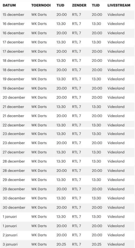 Vergeet niet om op tijd weer deel te nemen aan de PDC WK 2022 dartpoule via www.poules.com/dartfreakz of de Poules.com-App. Iedere pijl zal worden uitgezonden zoals te zien is in onderstaand uitzendschema.