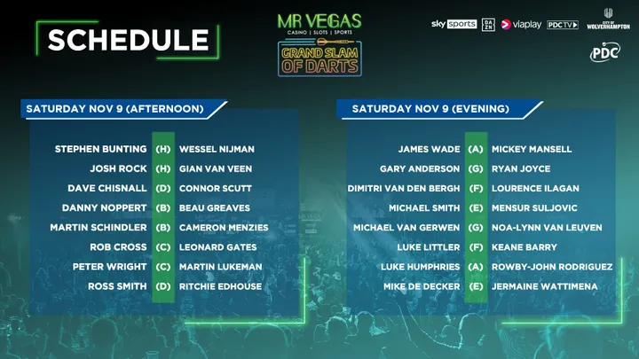 Hij doet dit tegen Stephen Bunting waarna Gian van Veen het podium op mag voor zijn partij tegen Josh Rock. Twee duels later zien we Danny Noppert tegen Beau Greaves.