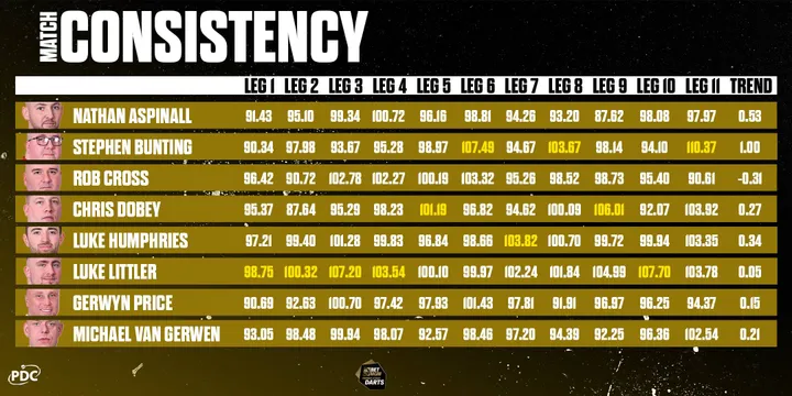 Terwijl de BetMGM Premier League 2025 zijn beslissende fase ingaat, werpt PDC-statisticus Christopher Kempf een blik op de leg-voor-leg prestaties van de acht deelnemers. Wat blijkt? De constante factor in een wedstrijd blijkt zeldzamer dan je zou denken.