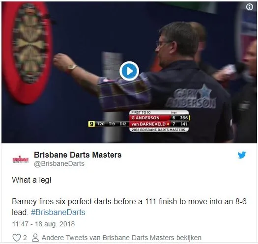 Gary Anderson nadat hij al vroeg tegen een 1-5 achterstand aankeek. Met prachtige finishes wist de Nederlander zich echter terug in de partij te knokken en hij mocht zelfs nog aanleggen voor een 9-darter. Het zou een hele belangrijke leg blijken voor de Hagenaar die we morgen terug zien op het podium in Australië.