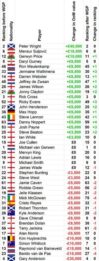 De World Grand Prix heeft diverse verplaatsingen teweeg gebracht op de Order of Merit.