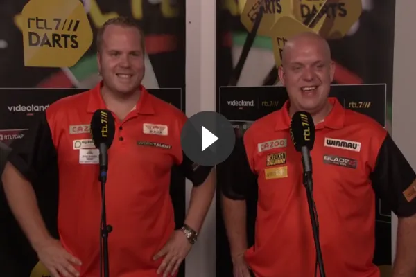 Michael van Gerwen weer voor de camera Arjan van der Giessen te woord. Het interview eindigde weer op een wijze zoals dat alleen bij dit duo kan.... Beelden van weer een komisch interview zijn .