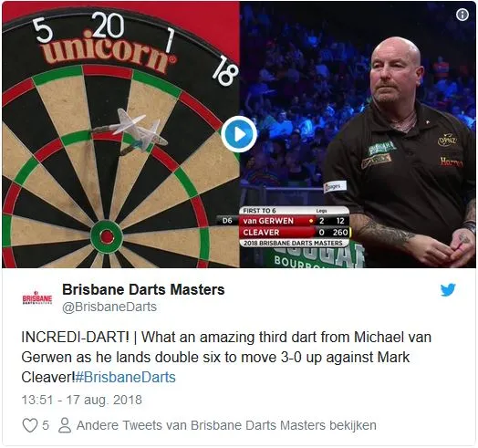 Michael van Gerwen wist de kwartfinale van de Brisbane Darts Masters te bereiken door Mark Cleaver met 6-2 te verslaan. Het mooiste shot van de partij kwam op naam van de Nederlander. Hij wist de dubbel in de derde leg op een indrukwekkende wijze te gooien waarbij hij zover naast de oche moest staan dat hij 2,50 meter moest overbruggen in plaats van de gebruikelijke 2,37 meter.