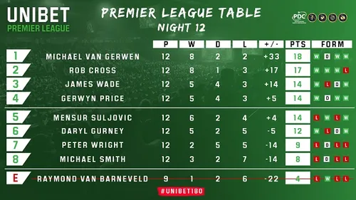 Uiteraard zorgen deze wedstrijden ook weer voor een nieuwe tussenstand in de Premier League. Zo pakt Michael van Gerwen de koppositie over van Rob Cross. Mighty Mike gaat nu aan de leiding met 18 punten, terwijl Voltage op 17 punten staat.