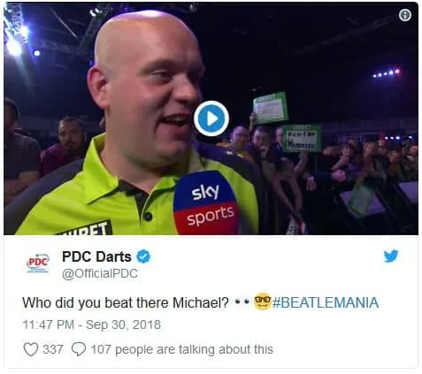 Vol overtuiging wist Michael van Gerwen de eerste ronde van de World Grand Prix door te komen door te winnen van Steve Lennon. Met 2-0 in sets en zonder een leg af te staan werd de Ier verslagen. Althans, dat is wat wij allemaal dachten. Na afloop blijkt de Nederlander namelijk een hele andere mening toebedeeld. Hij beweert in onderstaand filmpje tegenover de Engelse pers tegen een hele andere tegenstander te hebben gespeeld.