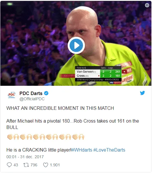 Het is één van de mooiste finishes die we dit PDC WK hebben gezien, de 161-finish van Rob Cross in de halve finale. Deze finish kwam op een cruciaal moment aangezien het 2-2 in sets en 2-2 in legs stond en de Nederlander het initiatief in de partij kon overnemen. Bovendien gooide Van Gerwen op dat moment een 180-er om een 81-finish te laten staan. Naast dat dit een geweldig moment was voor een dergelijke finish was de manier waarop deze werd gegooid ook zeer uniek te noemen. Alle reden om nogmaals te genieten van deze prachtige finish en de daaropvolgende reactie.