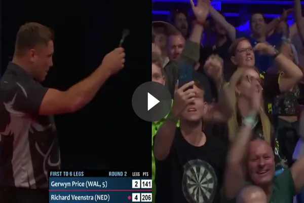 Gerwyn Price een opmerkelijk moment met het publiek tijdens de Hungarian Darts Trophy 2021. In duel met Richard Veenstra mocht de voormalig wereldkampioen namelijk aanleggen voor een 9-darter. Hij deed echter iets bizars toen hij voor dubbel 12 mocht gooien zoals te zien is op .