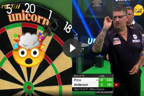 Tijdens de partij van Gary Anderson tegen Gerwyn Price deed zich een opmerkelijk moment voor in de negende leg. Vanaf 181 wist The Flying Scotsman iets te presteren dat we niet eerder hebben gezien. De reactie van The Iceman hierop was dan ook prachtig. Dit bizar moment is te bekijken op .
