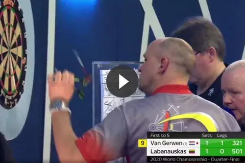 Een ongelukkig moment deed zich voor tijdens de kwartfinale van Michael van Gerwen tegen Darius Labanauskas op zondagavond. De man uit Litouwen bezeerde zich in de derde set toen hij een pijl uit zijn hand liet schieten. De pijl kwam in de wijsvinger van zijn linkerhand terecht en George Nobel werd erop gestuurd om een pleister te halen. Een opmerkelijk moment is hieronder te bekijken.