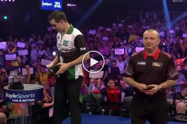 Darren Webster als zijn tegenstander zaterdagavond. The Demolition Man ging namelijk al voor de partij van start ging de fout in door water te knoeien over de dartspullen van zijn opponent. Het bleek dat één glas op zijn kop stond toen ze samen het podium betraden maar Webster had dit niet in de gaten en probeerde beleefd de glazen te vullen maar dat liep dus niet vlekkeloos. Het opmerkelijk moment is hieronder te bekijken.