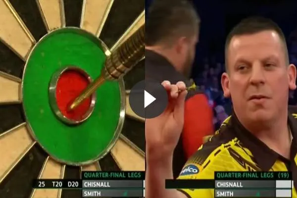 Dave Chisnall doet een duit in het zakje. Op de Masters gooide Chizzy de klassieker onder de bull-bull finishes in zijn duel met