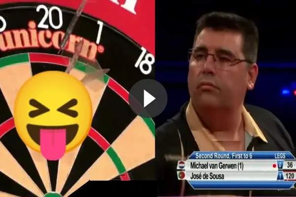 Michael van Gerwen staan vanavond tegenover elkaar in de Premier League. De twee kwamen nog niet vaak tegen elkaar uit maar wel hebben ze al een opmerkelijk moment samen beleefd. Ondanks dat De Sousa tegen de toenmalige nummer 1 van de wereld speelde, weerhield dit hem er niet van om voor een demo-shot te gaan. Het liep alleen uit op een groot fiasco waarbij de commentator stuk ging zoals te zien is op .