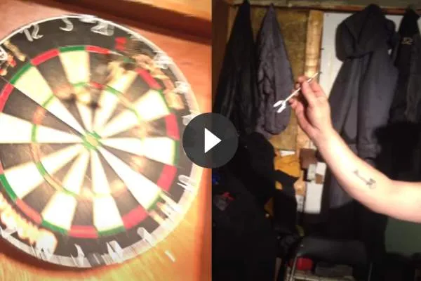 We hebben het allemaal wel eens geprobeerd om een paar pijlen achterstevoren te gooien. Maar daar waar de meeste al blij zijn als een pijl überhaupt in het bord blijft zitten maakt deze kerel er een sport. Hij is net zo lang blijven trainen tot zijn techniek in het achterstevoren darten zo goed was dat hij erin slaagde om op deze unieke wijze een 180-er te gooien zoals te zien is op .