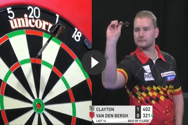 Dimitri van den Bergh vandaag een 9-darter te gooien in duel met Jonny Clayton. Daar waar de klassieke perfecte leg op dubbel 12 eindigt koos de Belg voor een andere variant. Zijn perfecte leg van vandaag is te bekijken op .