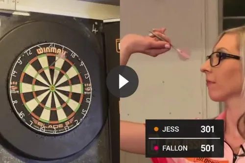 Veel mannen hebben de laatste maanden al hun meerdere moeten erkennen in Fallon Sherrock. Niet alleen op het PDC WK maar ook op verschillende demo-toernooien stond ze haar mannetje en kan ze zich meten met de grote namen. Donderdagavond zal ze haar Premier League-debuut maken met een wedstrijd tegen Glen Durrant. Alvorens het zover is speelde ze nog een duel voor de camera's tegen Jess, manager van een wedkantoor. Hij is geen professionele speler en dus kreeg hij een voorsprong van 200 punten. Zou het genoeg zijn om haar te verslaan? Dat zie je in onderstaande video.