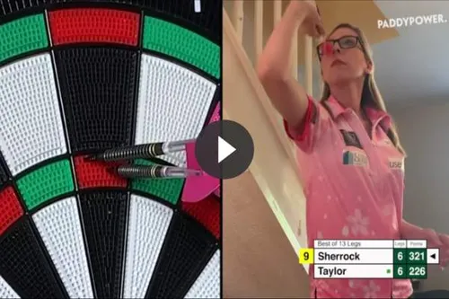 Gisterenavond speelde Fallon Sherrock een duel tegen Phil Taylor voor het goede doel. Het werd een hoogstaande partij die tot de laatste pijl spannend bleef. Bij een stand van 6-6 kwam het aan op de beslissende laatste leg waarin Fallon Sherrock aanlegde voor een 9-darter en waarbij de partij op een sensationele manier werd beslist zoals .