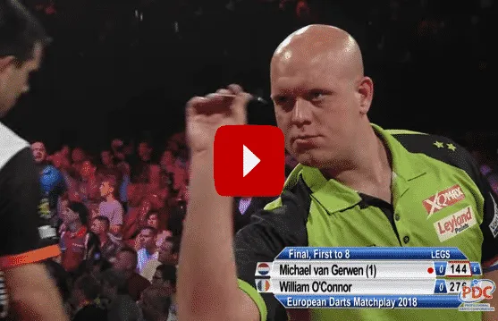 Afgelopen zondag wist Michael van Gerwen de European Darts Matchplay zijn naam te schrijven in Hamburg. Voor abonnees van waren de wedstrijden live te volgen maar voor overige dartsliefhebbers heeft de PDC inmiddels ook de finale openbaar gemaakt. Van Gerwen wist op zaterdag al een 9-darter te gooien en kwam in de finale ook tweemaal dichtbij. Ga er eens voor zitten en geniet van de volledige finale.