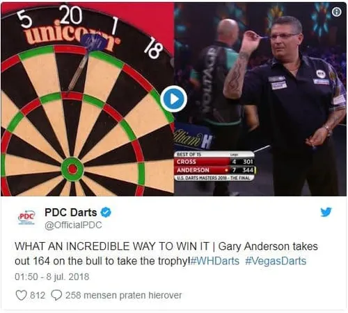 The Flying Scotsman pakte gisterenavond de titel van de US Darts Masters op een sensationele manier. De Schot wist in de finale Rob Cross te verslaan en besloot de partij op een prachtige wijze. Anderson liet 164 staan en werd door het publiek aangemoedigd om ervoor te gaan. Na een lichte twijfeling besloot hij het publiek zijn zin te geven en het gevolg is hieronder te zien.