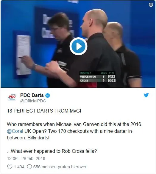 Michael van Gerwen tegenover elkaar in de vierde ronde en hierbij produceerde de Nederlander in drie legs wat anderen in een hele carrière nog niet lukt. Van Gerwen gooide een 170-finish, sloot daar achteraan een 9-darter en wist vervolgens nogmaals een 170-finish te gooien in de leg daarna. Geniet nogmaals van deze ongelooflijke prestatie!