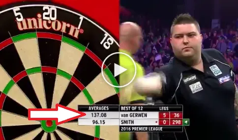 Vanavond staan Michael van Gerwen en Michael Smith tegenover elkaar in de Premier League. De laatste keer dat dit gebeurde was 2 jaar geleden en ontpopte zich tot een historische partij. We blikken terug op deze partij waarin tot op de dag van vandaag nog altijd het hoogste gemiddelde ooit live op televisie uitgezonden is gegooid. Zoals blijkt uit onderstaande beelden had dit record zelfs veel hoger uit kunnen dan 123,40.