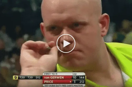 Van Gerwen wist de halve finale van de Dubai Darts Masters bijna met een 9-darter te eindigen. De Nederlander mocht aanleggen voor een 144-finish om zich te verzekeren van een plek in de finale. Zoals de beelden hieronder aantonen was hij goed op weg maar lukte het de Nederlander niet om historie te schrijven. Eerder dit toernooi zagen we