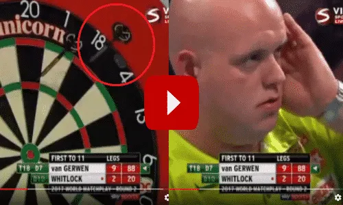 Zelfs de allerbeste speler van de wereld mist weleens het dartsbord, zo bleek woensdagavond in het duel tussen Michael van Gerwen en Simon Whitlock. Bij de stand van 9-2 in het voordeel van de Nederlander stond Van Gerwen op 88 en na het gooien van een single 20 vloog de tweede dartspijl buiten het bord. Logischerwijs zou een single 18 voor de bulls-eye de beste optie zijn geweest maar het heeft er alle schijn van dat zijn voorkeur uitging naar de dubbel 18 gevolgd door een dubbel 16.