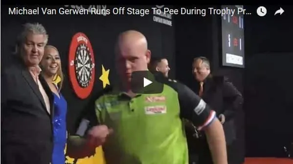 Na afloop van de finale wordt er zoals gebruikelijk de prijsuitreiking gedaan, maar voor Van Gerwen was de nood zo hoog opgelopen dat er iets ander voor ging. De nummer 1 van de wereld liet 'subtiel' weten dat hij even een bezoek aan het toilet moest brengen en nam daarna direct een sprintje van het podium af.