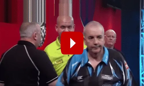 Phil Taylor. Op miraculeuze wijze wist de nummer 1 van de wereld alsnog de winst met 8-7 op te eisen wat door The Power uiteraard niet gewaardeerd werd. Taylor mopperde na het geven van de hand hetgeen Van Gerwen deed doen glimlachen om vervolgens richting het publiek te lopen en zijn tong symbolisch uit te steken. Beelden hiervan zijn hieronder te bekijken.