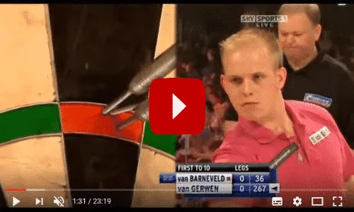 Raymond van Barneveld hierin tegenover elkaar. Prachtige beelden om 8 jaar na dato nogmaals terug te kijken met de wetenschap dat de toen pas 20-jarige Van Gerwen later de dartswereld op zijn kop zou zetten.