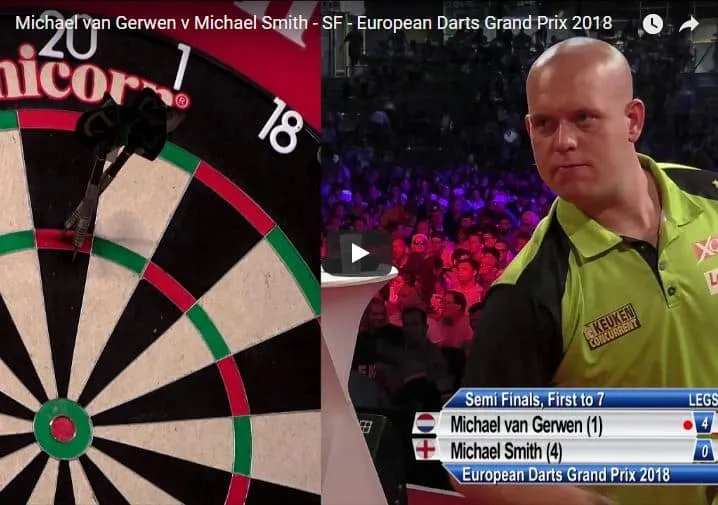 Michael Smith in de halve finale. In slechts 10 minuten werd Bully Boy opzij gezet waarbij hij een 7-0 nederlaag moest incasseren en waarbij hij als ultieme vernedering zelfs een 10-darter op de bulls-eye om zijn oren kreeg. Beelden van deze halve finale zijn hieronder te bekijken.